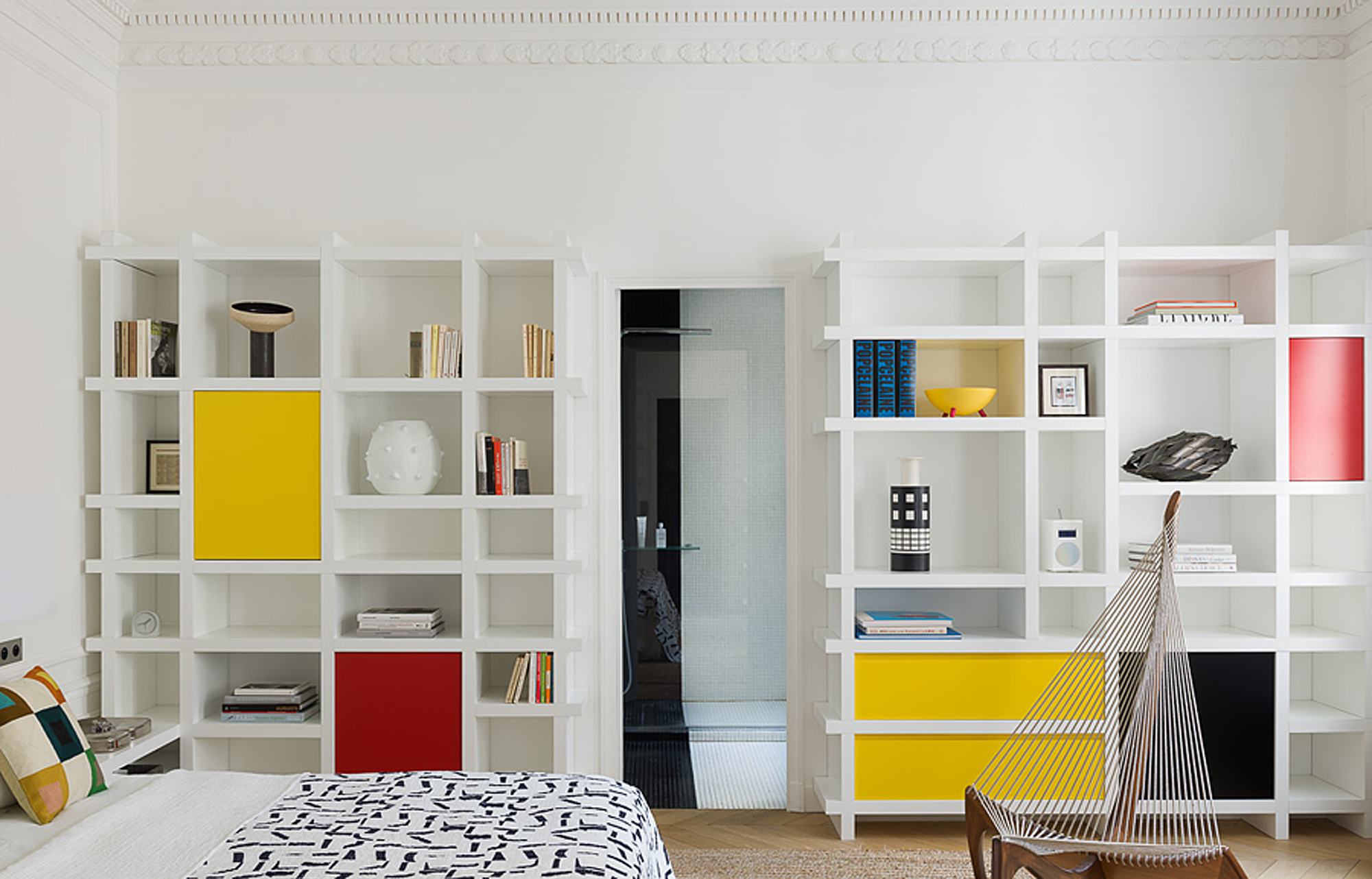 THIS EMPHASIS…on restoration was balanced with an ample dose of modern / contemporary style, with highligts including a custom Mondrian-inspired bookcase by project architect Alireza Razavi and a well appointed curation of iconic 20-21st century furnishings by decorator Sylvie Acker. |