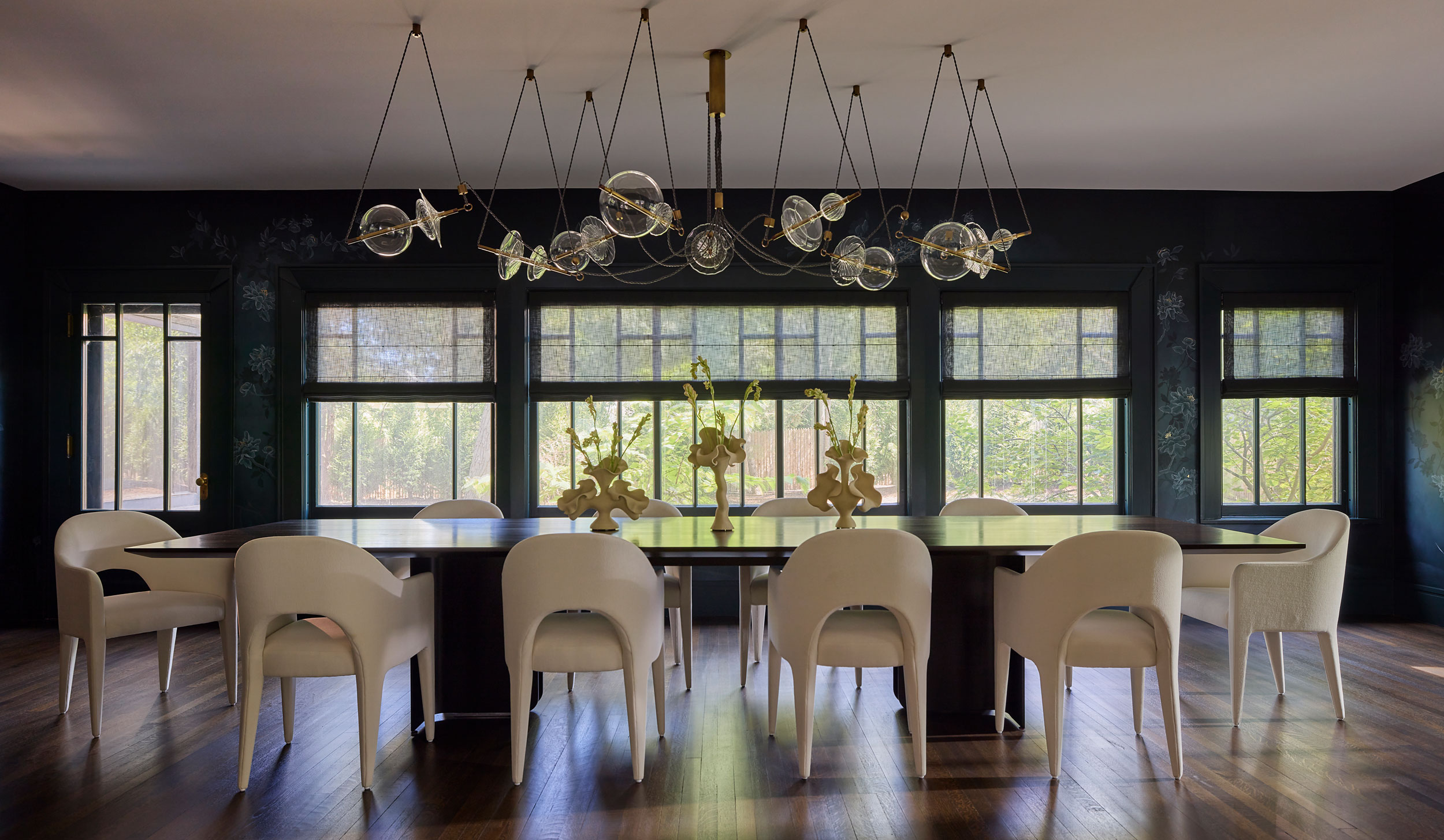 A hand-painted mural by local artist Julie Lawrence envelops the space, setting an unmistakable mood. The artwork was personalized to include flowers from the client’s wedding bouquet, weaving personal history into the fabric of the home. Overhead, a Silvio Mondino Studio Chemistry Trapezi Chandelier composed of hand-blown glass orbs sprawls organically across the ceiling. Its modular nature allowed the installation to be tailored precisely to the room, creating a sculptural focal point that draws the eye inward. This tension—between old and new, refined and daring—is exactly what gives the dining room its energy.