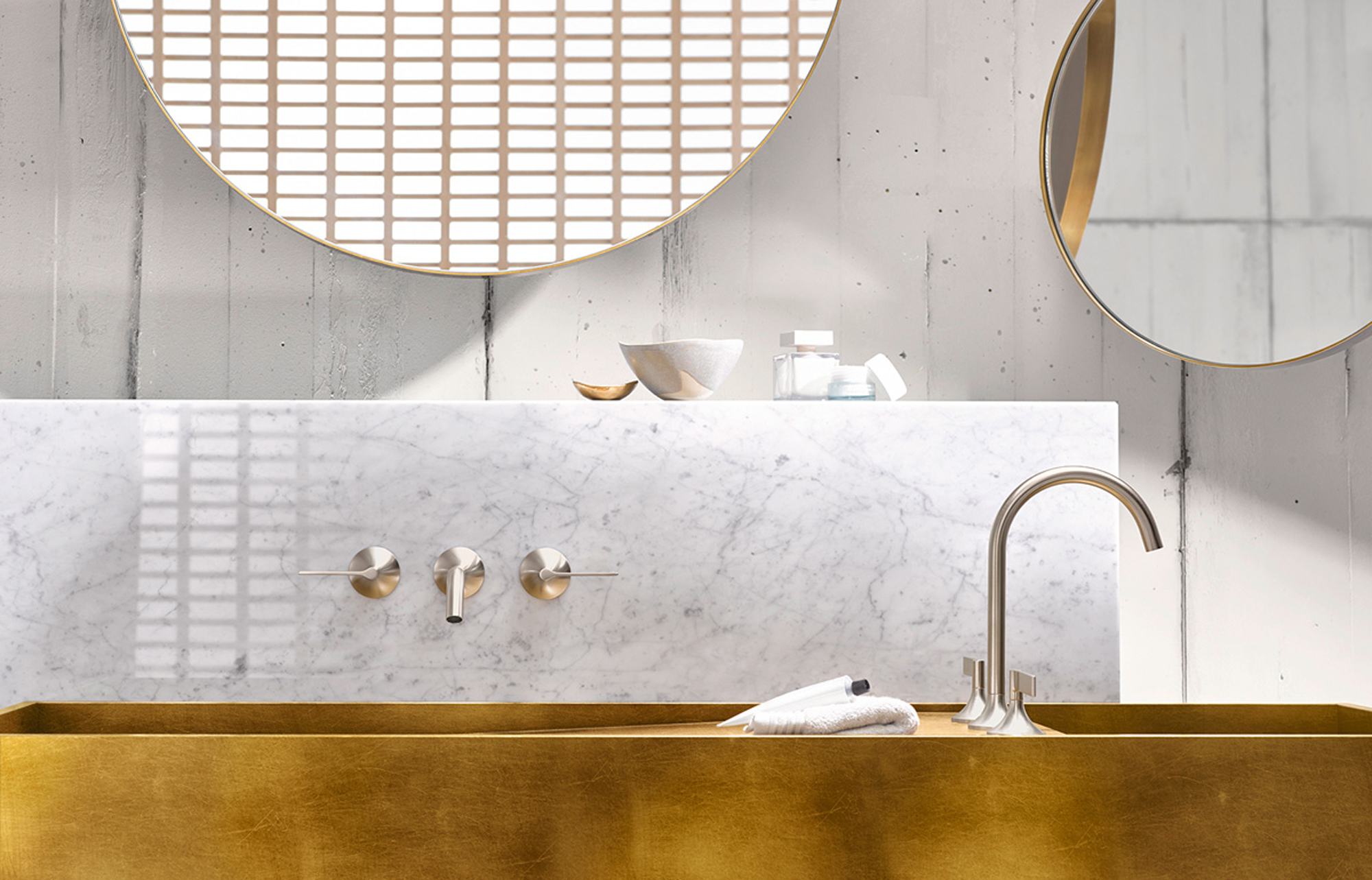 FORM…is the star of the show in this space rendered in an unconventional blend of brass, Carrara marble, light wood and matte platinum. |