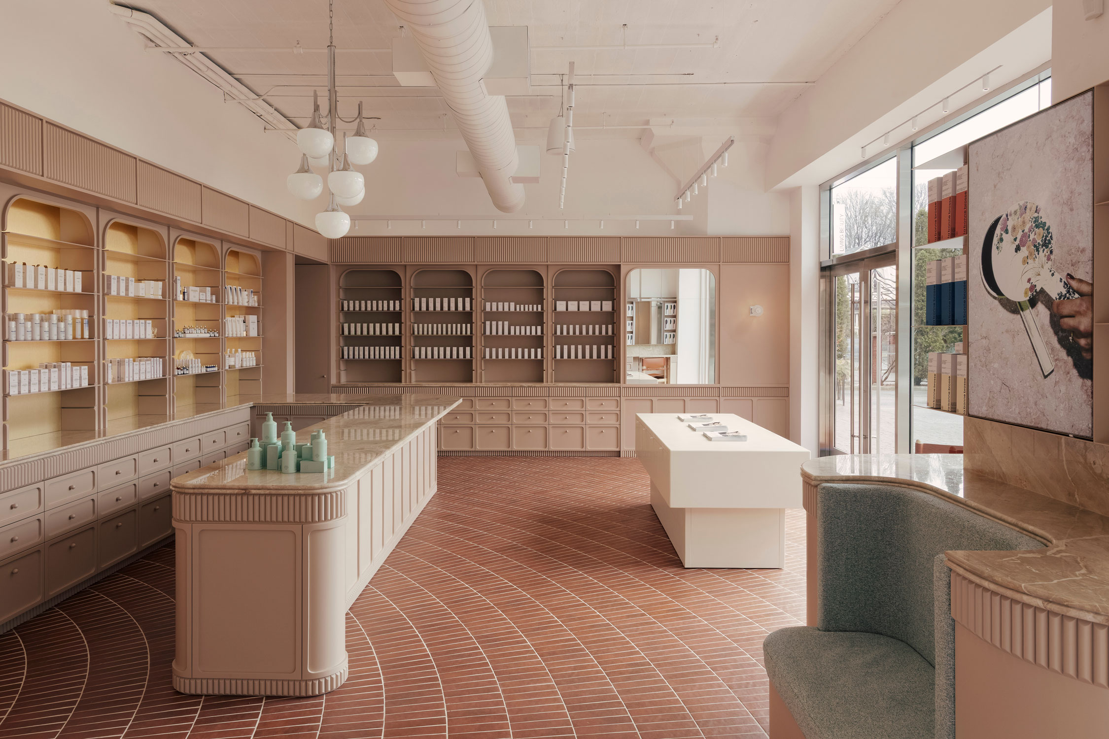 “The design of Living Beauty takes an interpretive and loose approach to referencing the past—from its dialogue with the heritage building it inhabits to the way it learns from the apothecary typology,” the designers explain. “While we wanted to bring forth what feels great about bygone spaces, we wanted to ensure the project still felt decidedly contemporary.”