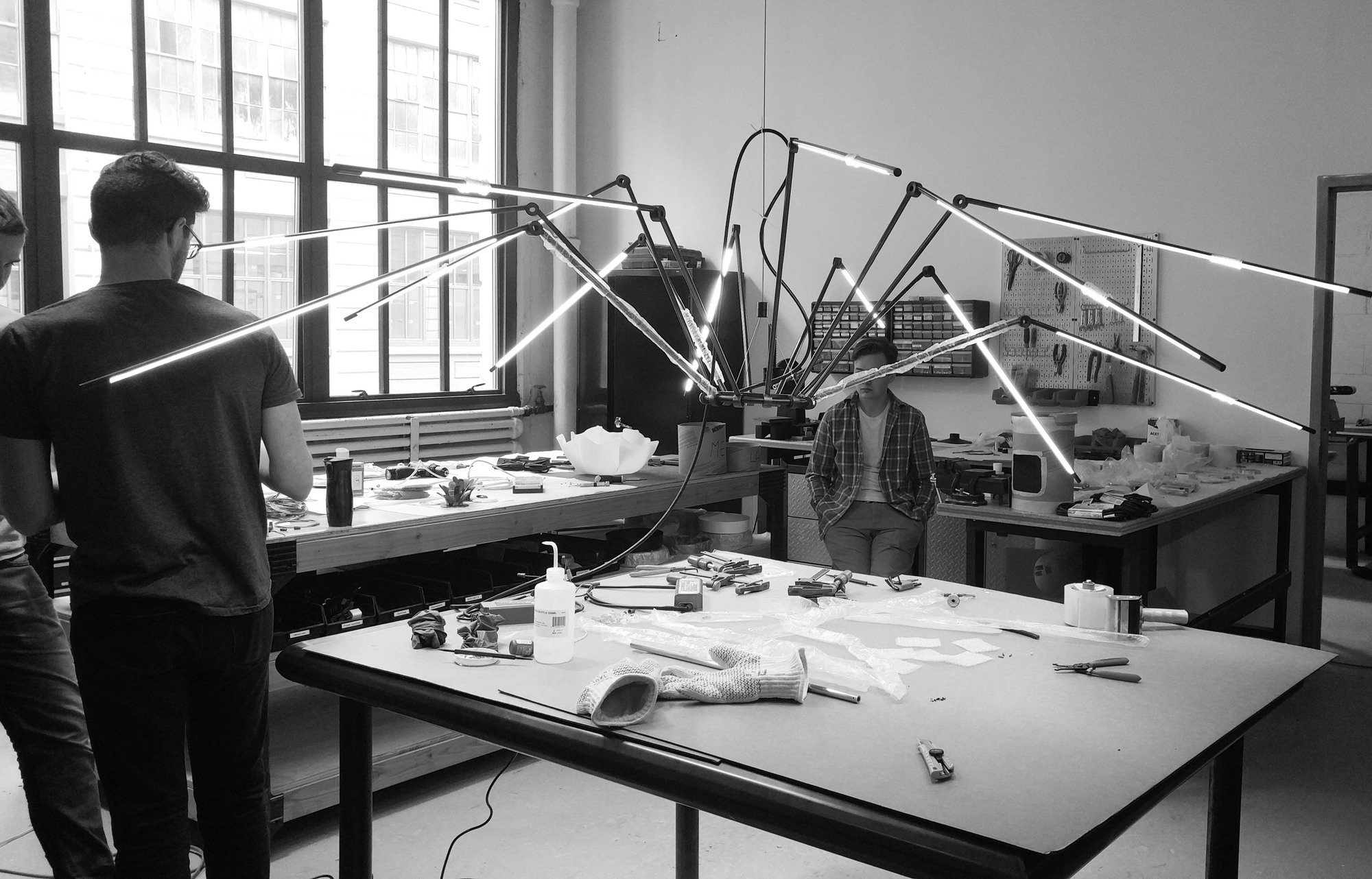 EACH ARM…is comprised of precision-machined 1/2″ brass tubing laced with LEDs and jointed via a proprietary system of springs and miniature connectors. The result is a fixture that ranges in width from 1 to 10 feet, all while taking on a myriad of forms along the way. |